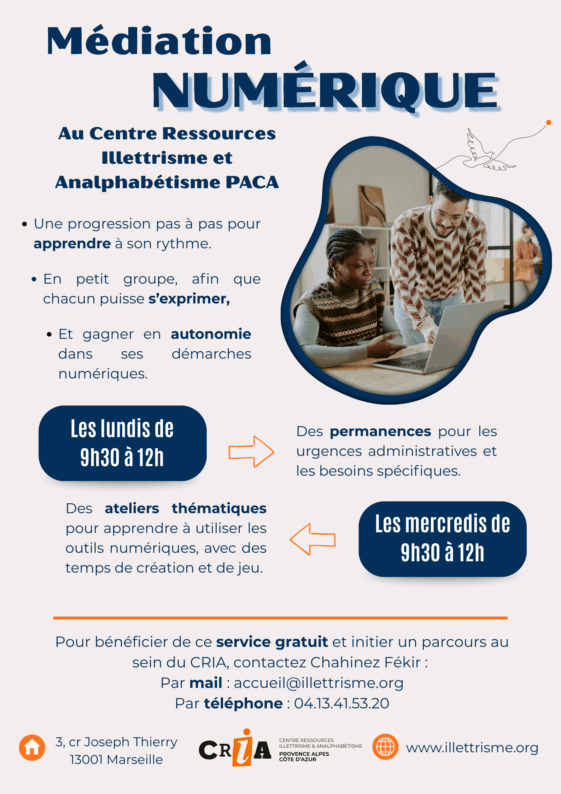 Trouvez de l’aide au Centre Ressources Illettrisme Numérique, au 3 Cours Joseph Thierry, 13001 Marseille – 1er étage, dans un lieu ouvert et équipé (tablettes & ordinateurs) où vous serez accompagné à l’acquisition de compétences numériques de base.